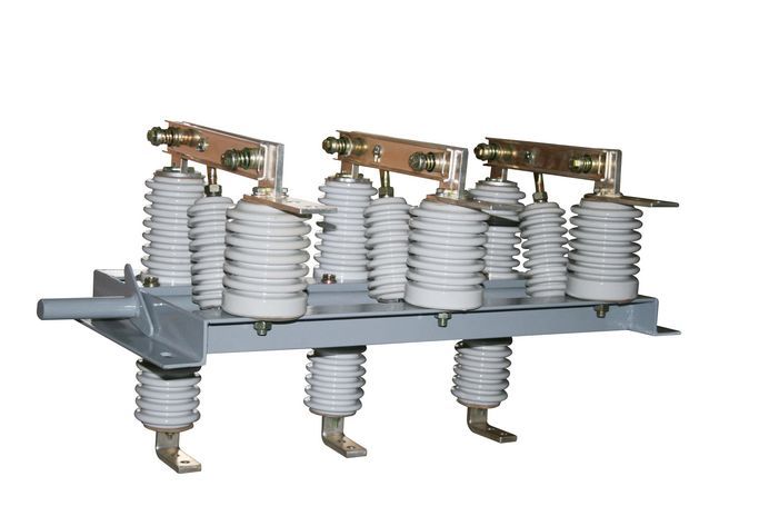 GN19-10/400A GN19-10/630A GN19-10/1000A GN19-10/1250A戶內高壓隔離開關的每相導電部分通過兩個支柱絕緣子固定在底座上。(GN19-10C/400A、GN19-10C/630A、GN19-10C/1000A、GN19-10C/1250A型則為一個為支柱絕緣子,一個為瓷套管絕緣子)三相平行安裝,導電部分由觸刀、靜觸頭、觸座(或導電桿)組成。每相觸刀中間均連有拉桿絕緣子,拉桿絕緣子與安裝在底座上的主軸相連。主軸通過手柄與連桿和CS6-1型手力機構相連在一起連動。觸刀由兩片槽形銅板組成,它不僅增大了觸刀散熱面積,對降低溫度有利,而且提高了觸刀的機械強度,使開關的動穩定性提高。觸刀一端通過螺栓安裝在觸座上(或導電桿上)。為轉動接觸觸刀,另一端與靜觸刀系可分連接,而觸刀觸壓力靠兩端的彈簧來維持。